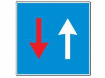 Montat pe sectoarele de drum ingustat unde nu au loc sa circule doua vehicule unul pe langa celalalt indicatorul din imagine este precedat de indicatorul Drum ingustat. La intalnirea acestui indicator, conducatorul autovehiculului are prioritatea fata de toate autovehiculele care circula din sens opus.