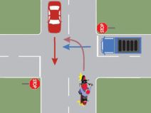 BIntersectia din imagine este dirijata prin indicatoare. Autocamionul intalnind indicatorul "Stop" va acorda prioritate si va trece ultimul.