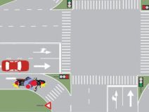 BIn cazul de fata motocicleta se afla pe o banda de decelerare care ii permite virajul la dreapta fara a mai fi nevoit sa astepte la semafor(semaforul nu i se adreseaza in acest caz). Totusi el va trebui sa acorde prioritate vehiculelor aflate pe prima banda a drumului pe care a virat. Singurul obligat sa respecte semnalul semaforului este autoturismul.