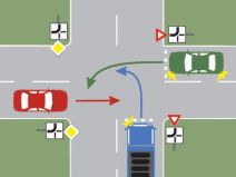 BIn intersectia dirijata din imaginea alaturata prioritate de trecere va avea autoturismul rosu deoarece intalneste indicatorul de "Drum cu prioritate". Intre celelalte doua autovehicule drept de trecere va avea autoturismul verde deoarece vin de pe drumuri cu acelasi nivel de prioritate, iar autocamionul este obligat sa acorde prioritate de drepta.