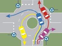 CLegislatia nu stabileste o regula, dar este indicat daca virati pe prima sau a doua iesire la dreapta sa utilizati banda 1(deci autoturismul violet si rosu s-au incadrat bine), iar daca iesiti pe a doua, a treia, virati la stanga sau intoarceti sa folositi banda 2 sau 3(restul autoturismelor). Prin urmare toate autoturismele din imagine circula corect prin intersectie.