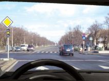 AImaginea alaturata prezinta o intersectie dirijata prin semafoare, indicatoare si marcaje in care semafoarele functioneaza doar pe lumina galbena intermitenta. In acest caz se va tine cont de indicatoare si marcaje. Fiind incadrat pe banda cu marcajul care prezinta o sageata inainte si intalnind indicatorul de "Drum cu prioritate", veti reduce viteza(pentru a putea opri in caz de pericol) si va veti continua drumul pe directia inainte fara a fi obligat sa acordati prioritate de trecere altui autovehicul cu exceptia celor prioritare(daca este cazul).
